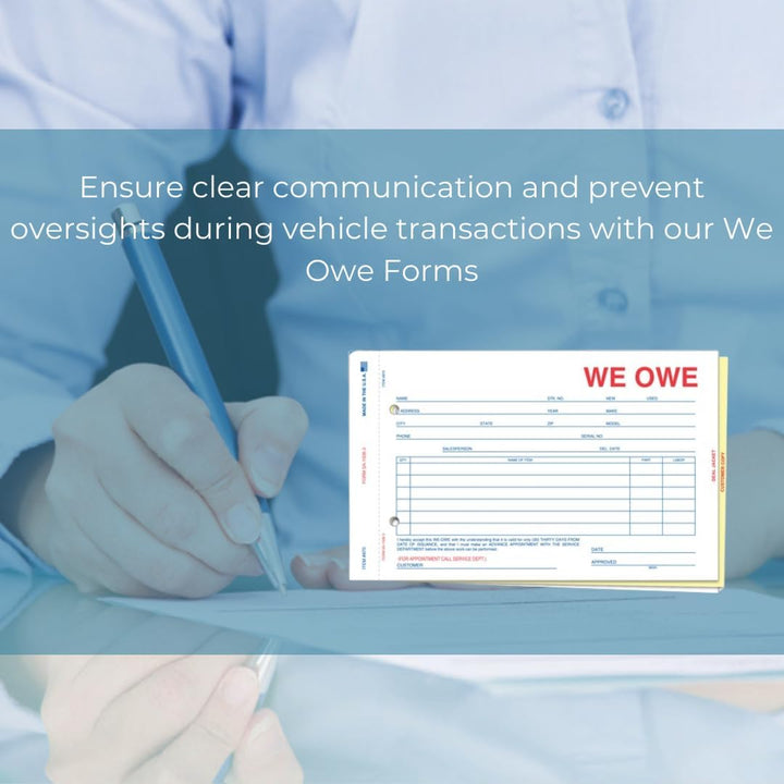 Ensure clear communication and prevent oversights during vehicle transactions with our We Owe/You Owe Forms. These 3-part/4-part snap-out forms provide a comprehensive written agreement between you and your customer, documenting any items or paperwork owed at the time of delivery. These forms offer a practical design for easy completion and distribution. The form features varying lengths to accommodate different requirements, ensuring all essential details are accurately captured. With bulk pack, you'll have an ample supply to support your dealership's needs, facilitating smooth transactions without missing crucial paperwork.