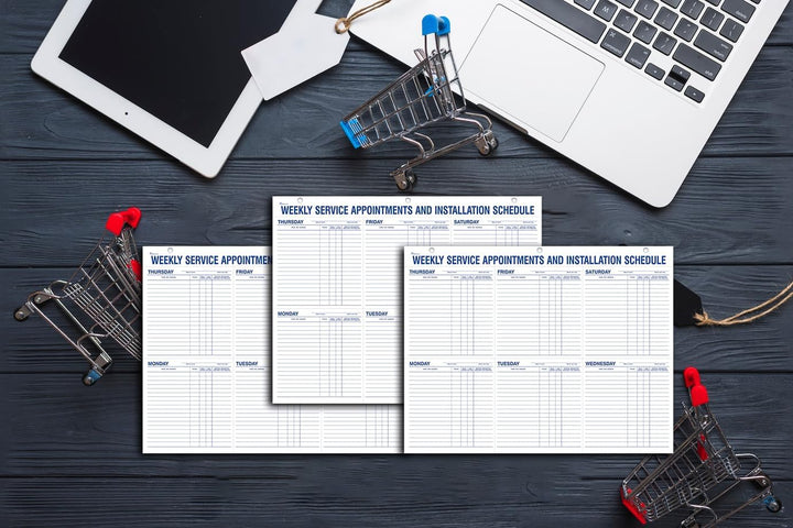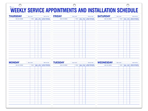 Keep your service appointments and installation schedules organized with our Weekly Service Appointments and Installation Schedule Pad. This large 22" x 17" pad features 60# white paper, providing ample space for recording important details. Each sheet is horizontally and vertically perforated, allowing for easy removal of each day of the week. With designated spaces for the date, customer name, address, phone number, technician, time of day, and the service requested, this pad ensures thorough and efficient record-keeping. Additionally, the pad is conveniently punched with three holes across the top for easy storage in binders or folders. Packaged with 52 sheets per pad, this product offers a comprehensive solution for managing your service appointments and installations throughout the year.