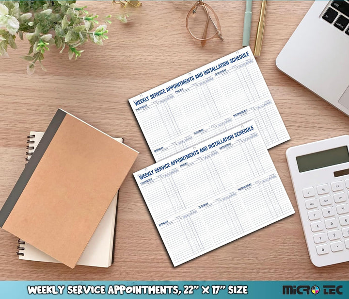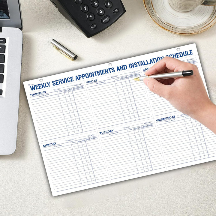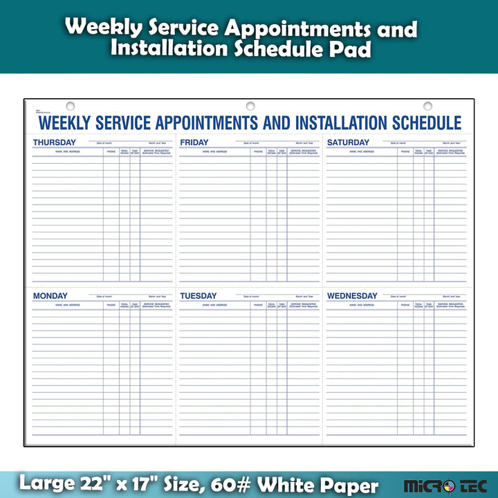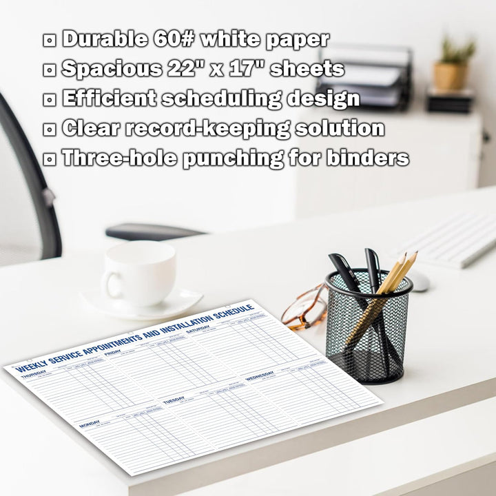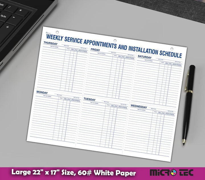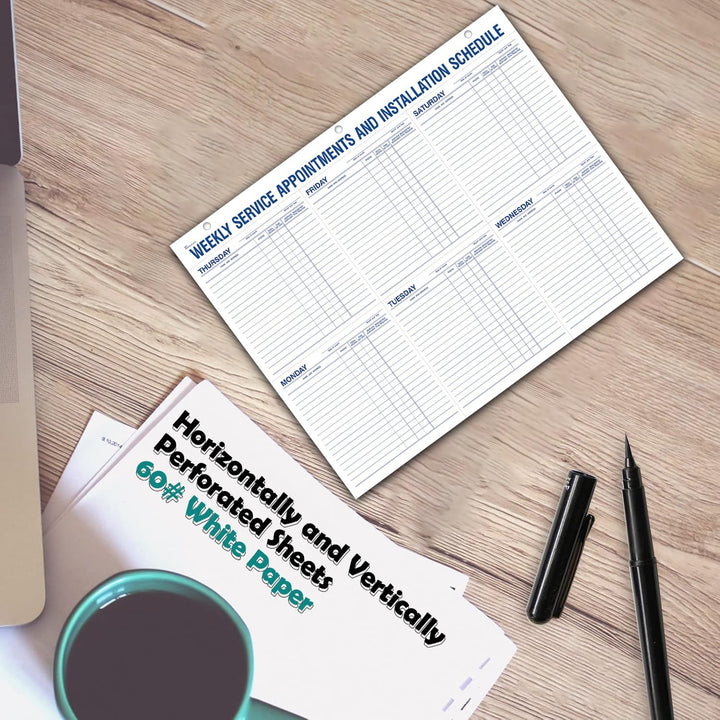 Weekly Service Appointment and Installation Schedule Pad – 22" x 17" Office Desk Pad – 60# White Paper, Horizontally & Vertically Perforated –(Packaged 52 sheets per pad)